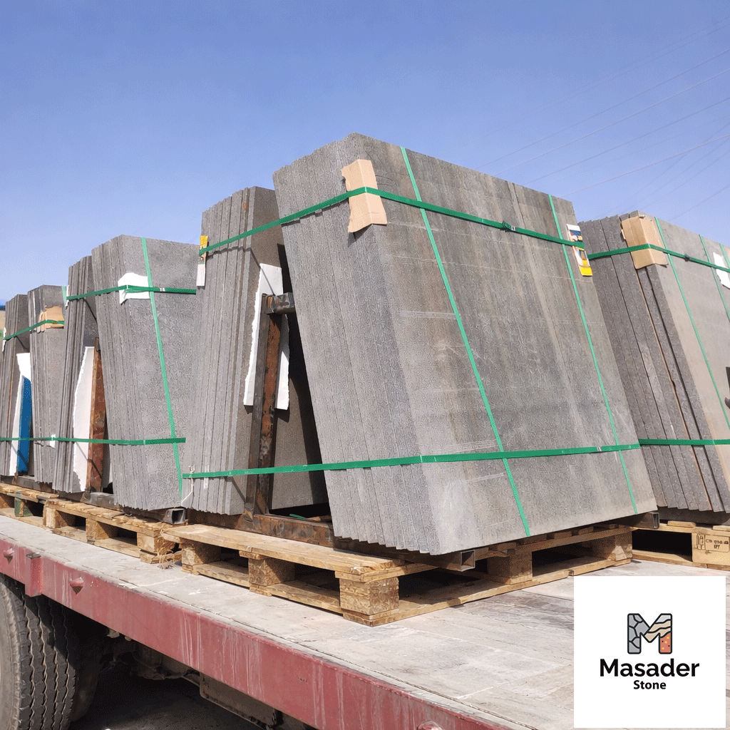 حجر البازلت مقصوص حسب الأبعاد النهائية المطلوبة من العميل، مع تشطيب قص منشار فقط وسماكة معايرة لإظهار اللون والشكل الطبيعي للحجر مع أقل قدر ممكن من المعالجة.